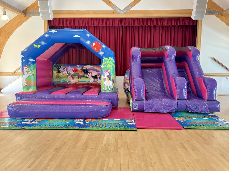 The Unicorn Bouncy Castle and Unicorn themed 5ft Platform Slide package combines two of our most popular products from our Unicorn Range . Both inflatables feature unicorns, butterflies and rainbows in a playful pink and purple colour scheme. Perfect for those looking for Unicorn themed party ideas and guaranteed to be the stand out attraction.