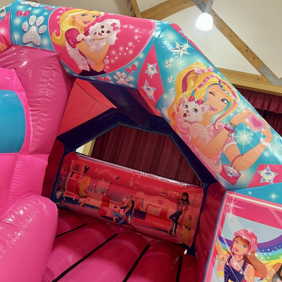 This Impressive 3D Barbie Bounce and Slide comes with a netted back wall as standard and includes a fully fitted shower cover / sun shade to prevent the Great British weather spoiling your party.