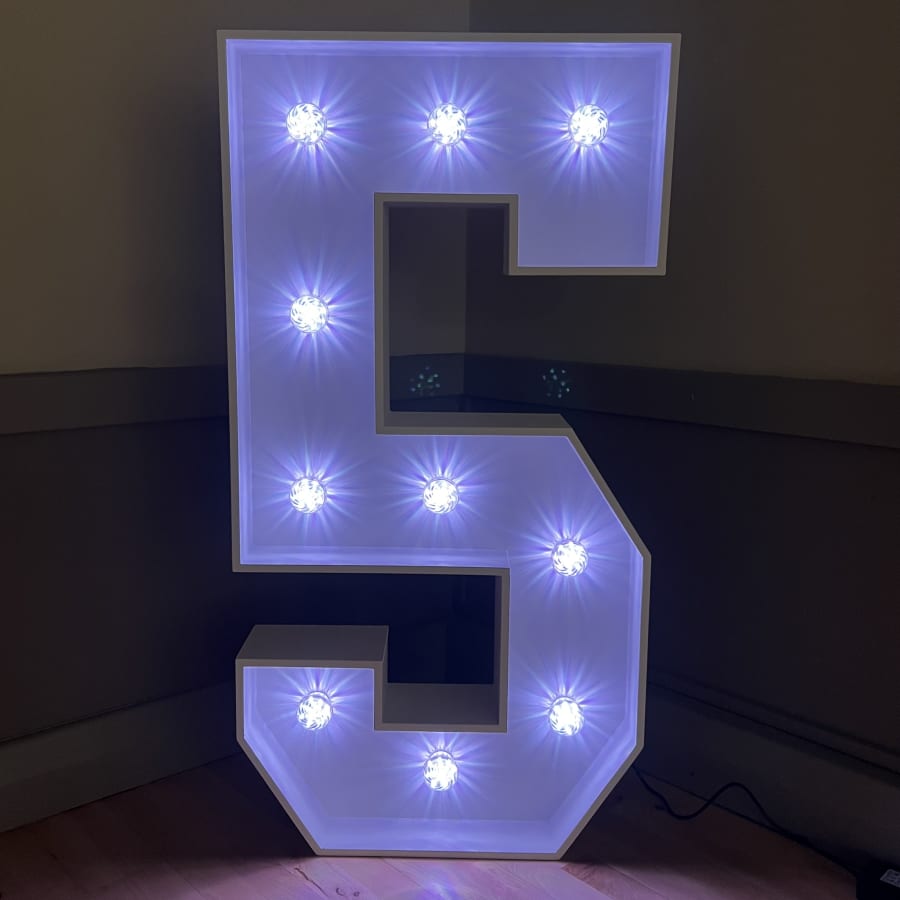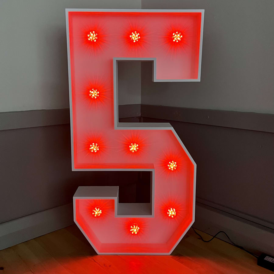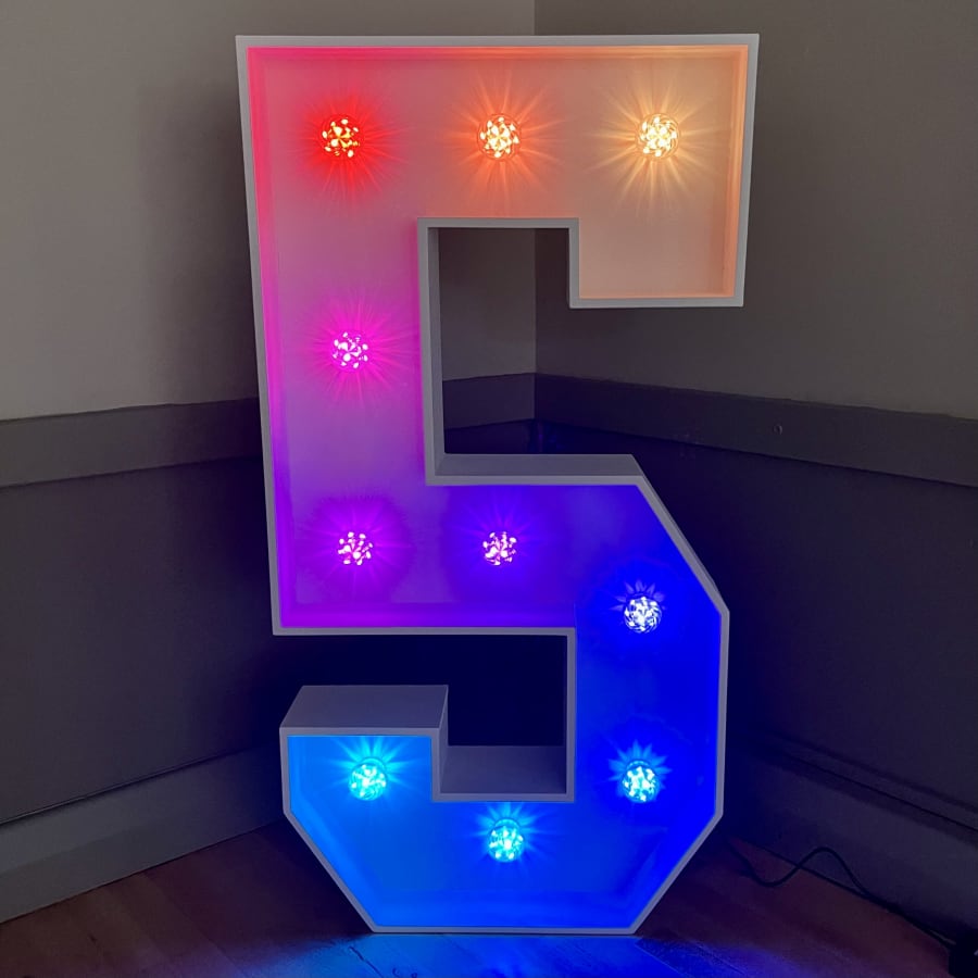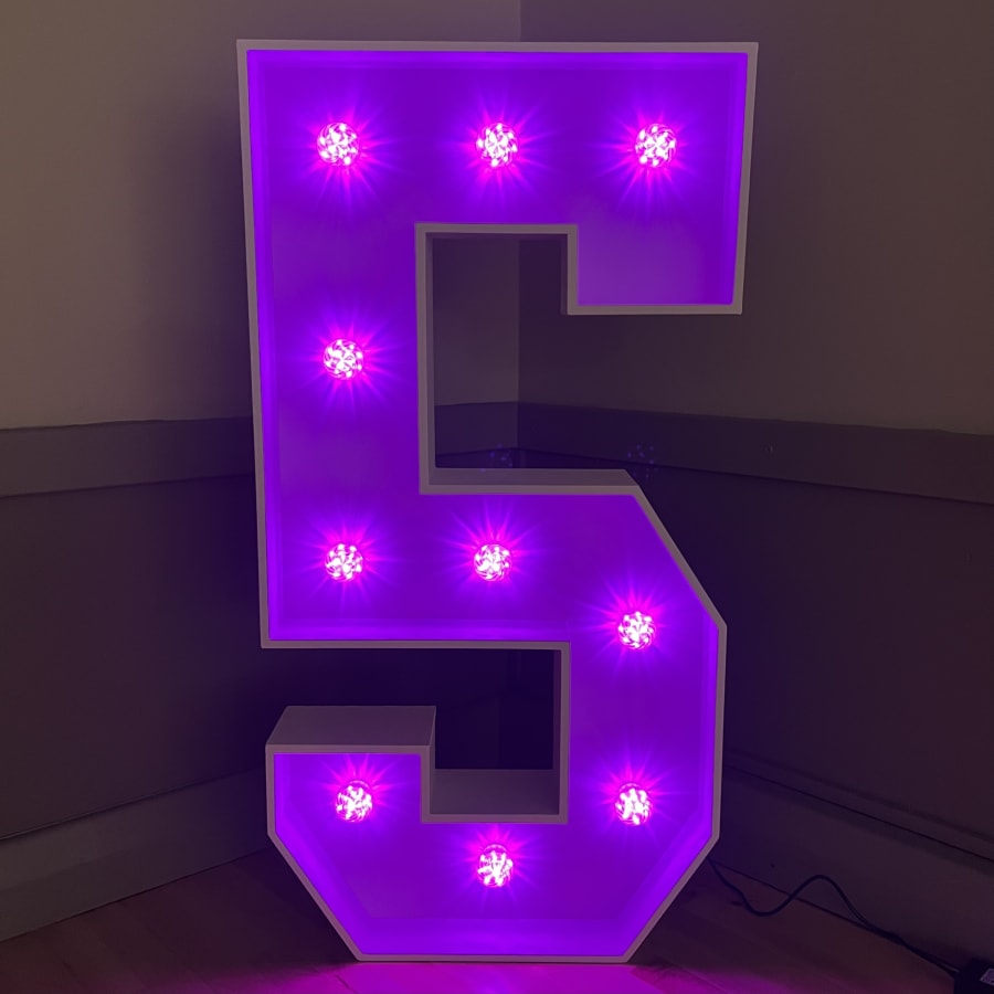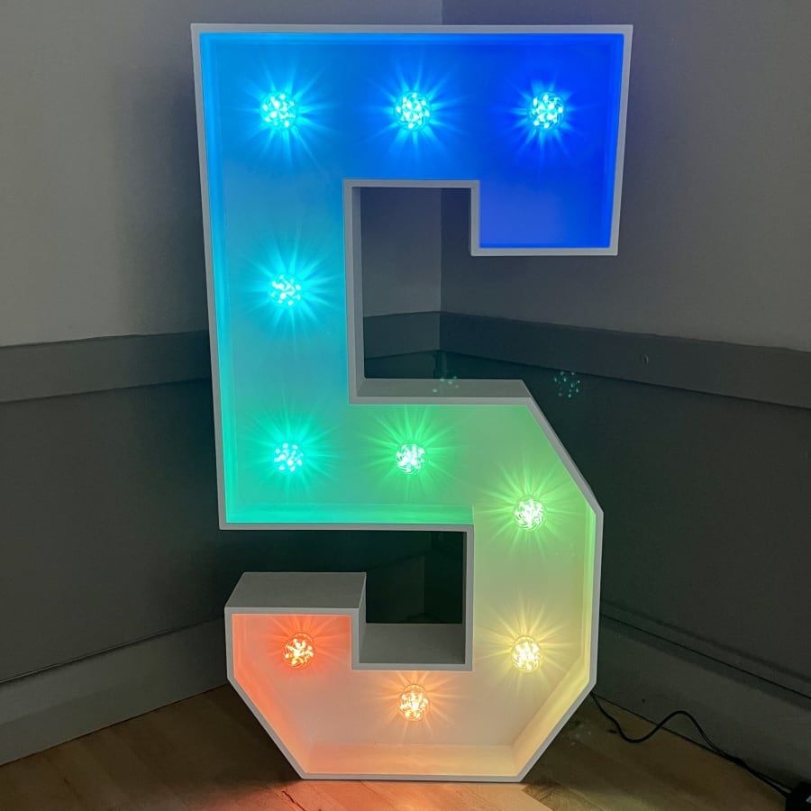 Our 4ft Light-Up LED Numbers can be set to a variety of stunning colours to match your theme. Whether you want a classic white glow, a vibrant multi-coloured display, or a specific colour like pink, blue, purple, yellow, orange, red or green, our LED Number 5 can bring your vision to life!