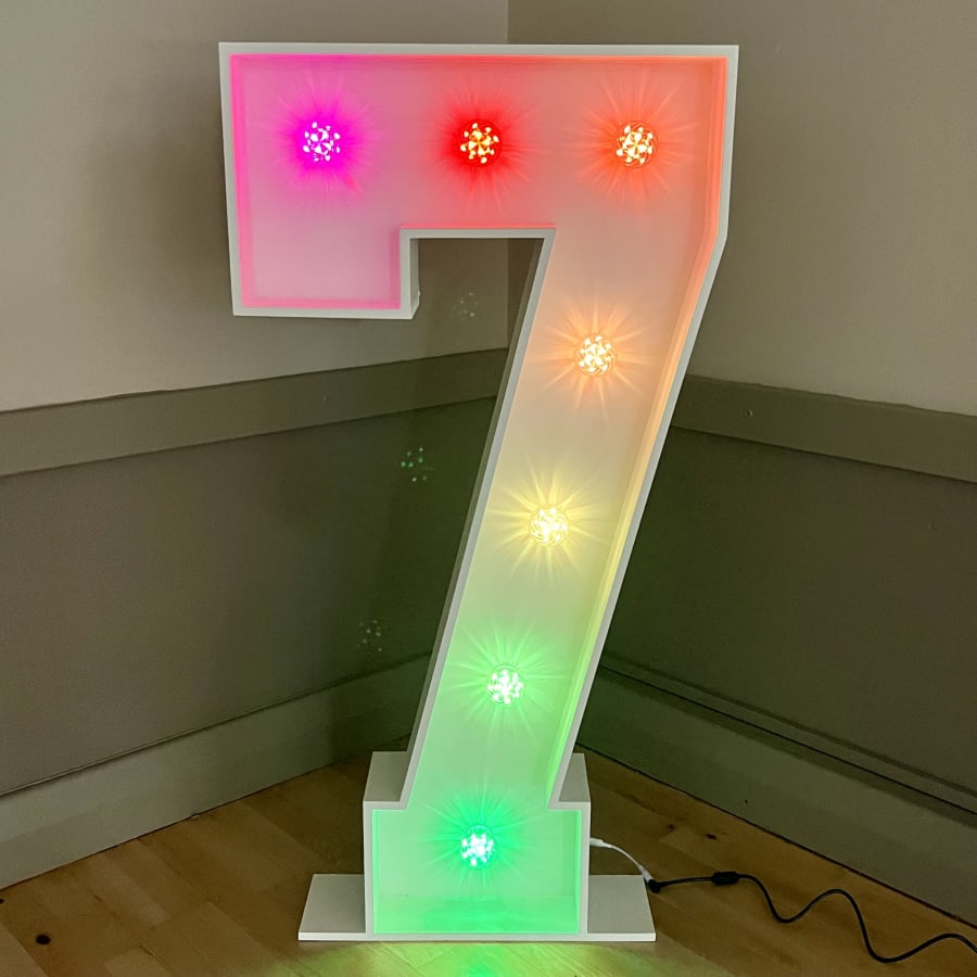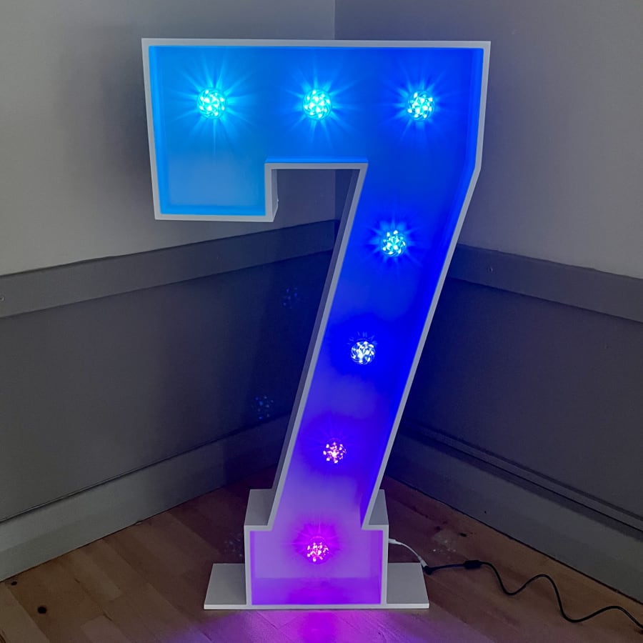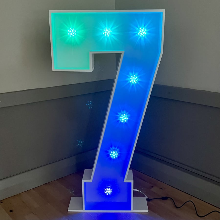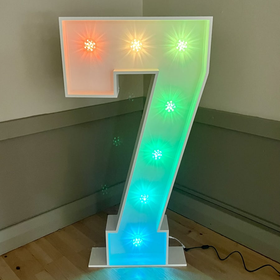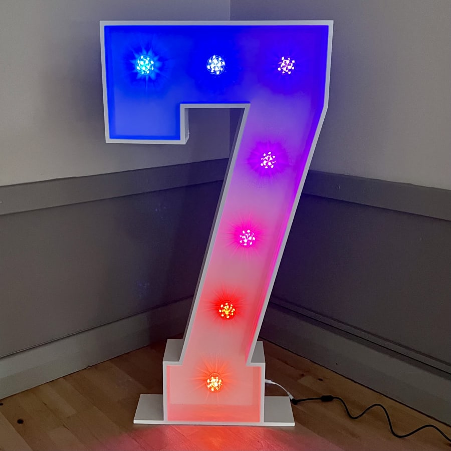 Our 4ft Light-Up LED Numbers can be set to a variety of stunning colours to match your theme. Whether you want a classic white glow, a vibrant multi-coloured display, or a specific colour like pink, blue, purple, yellow, orange, red or green, our LED Number 7 can bring your vision to life!