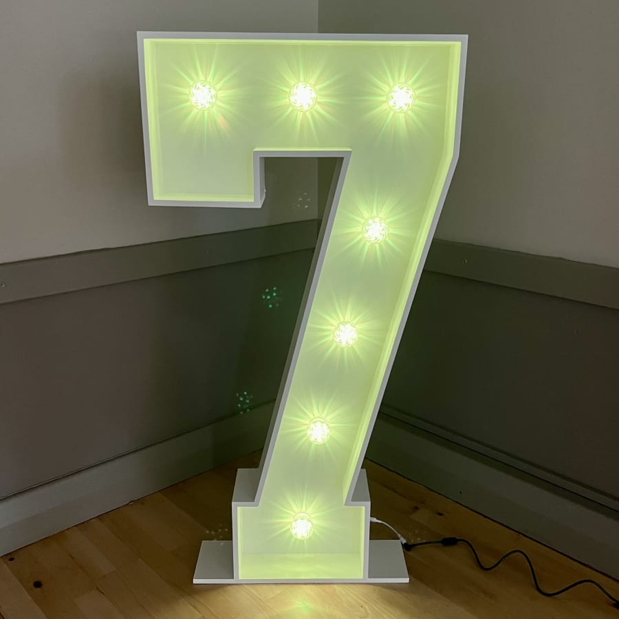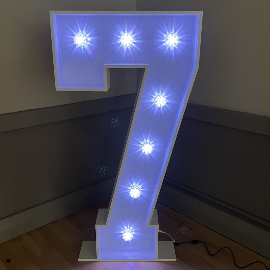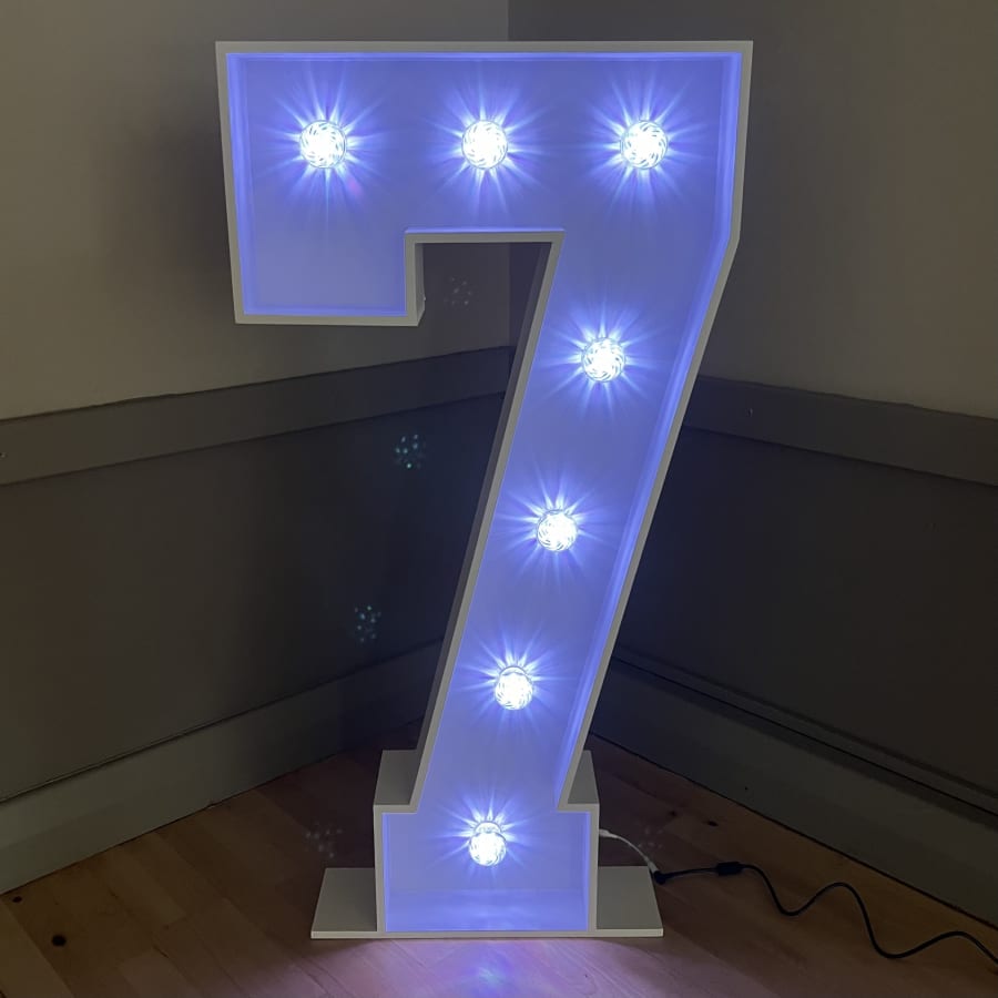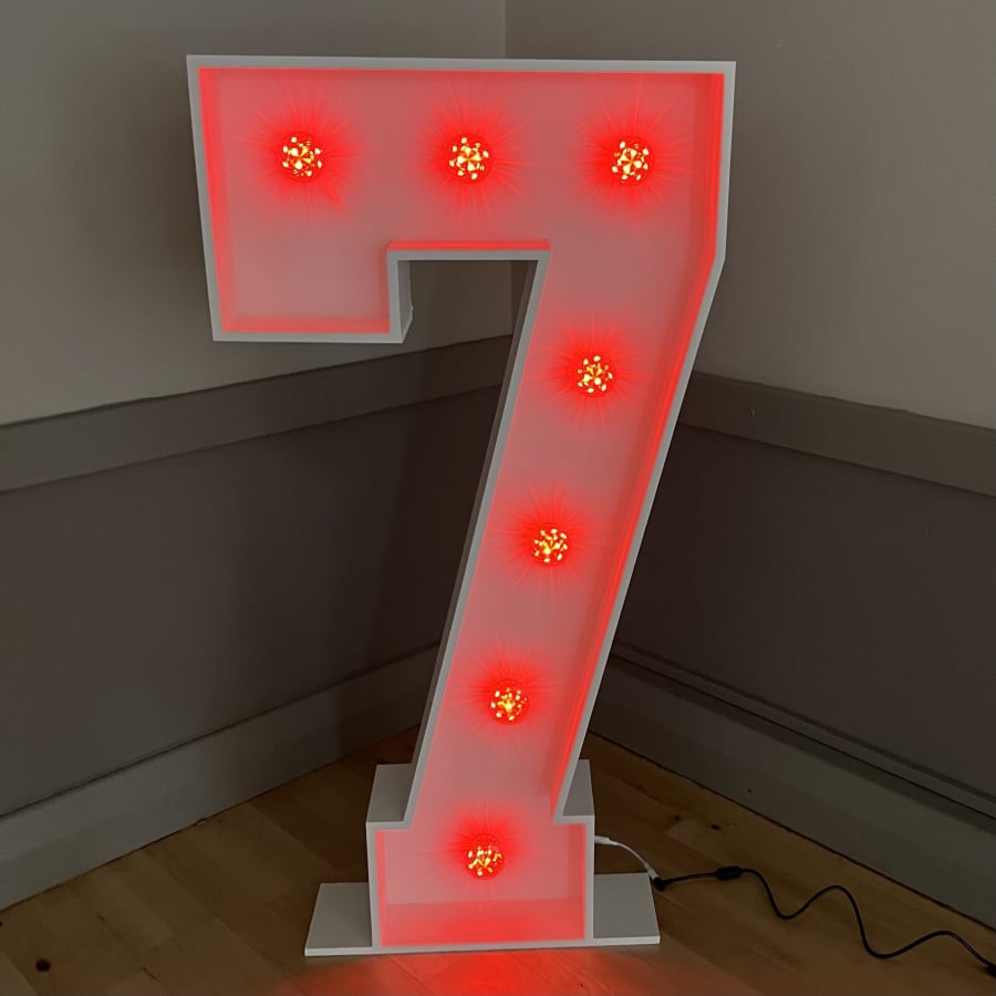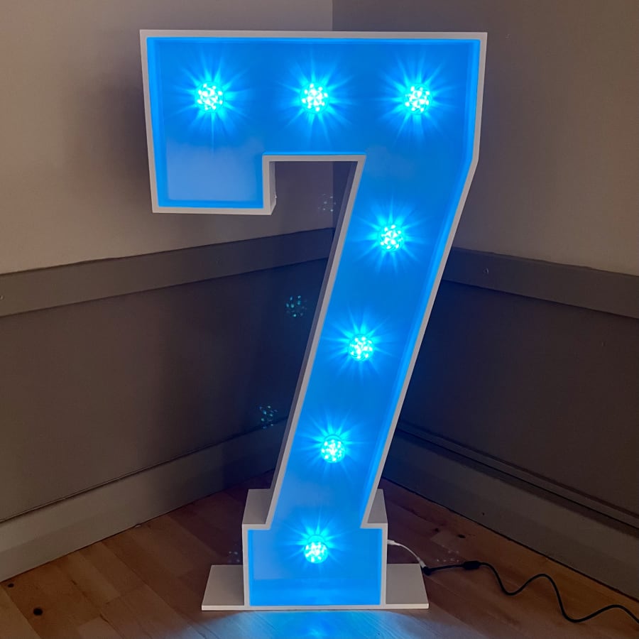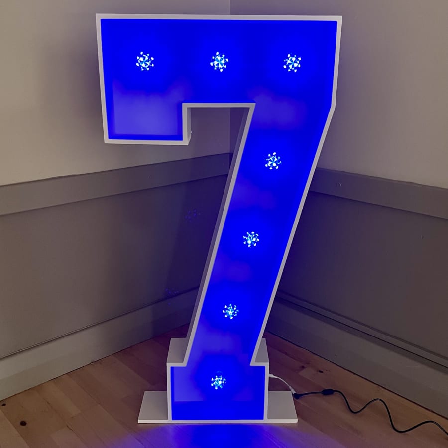 Our 4ft Light-Up LED Numbers can be set to a variety of stunning colours to match your theme. Whether you want a classic white glow, a vibrant multi-coloured display, or a specific colour like pink, blue, purple, yellow, orange, red or green, our LED Number 7 can bring your vision to life!