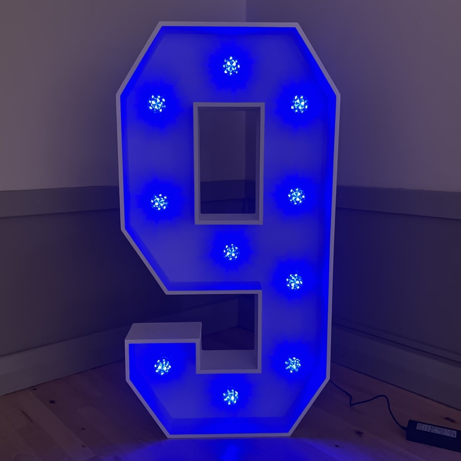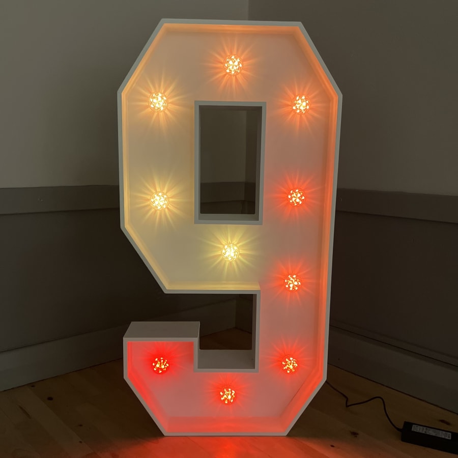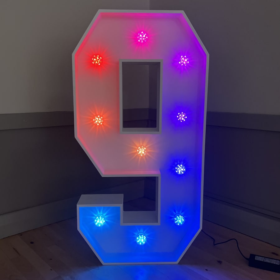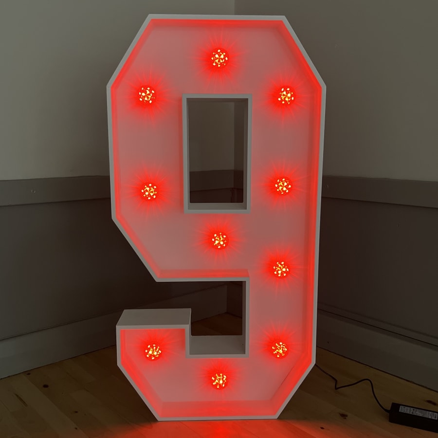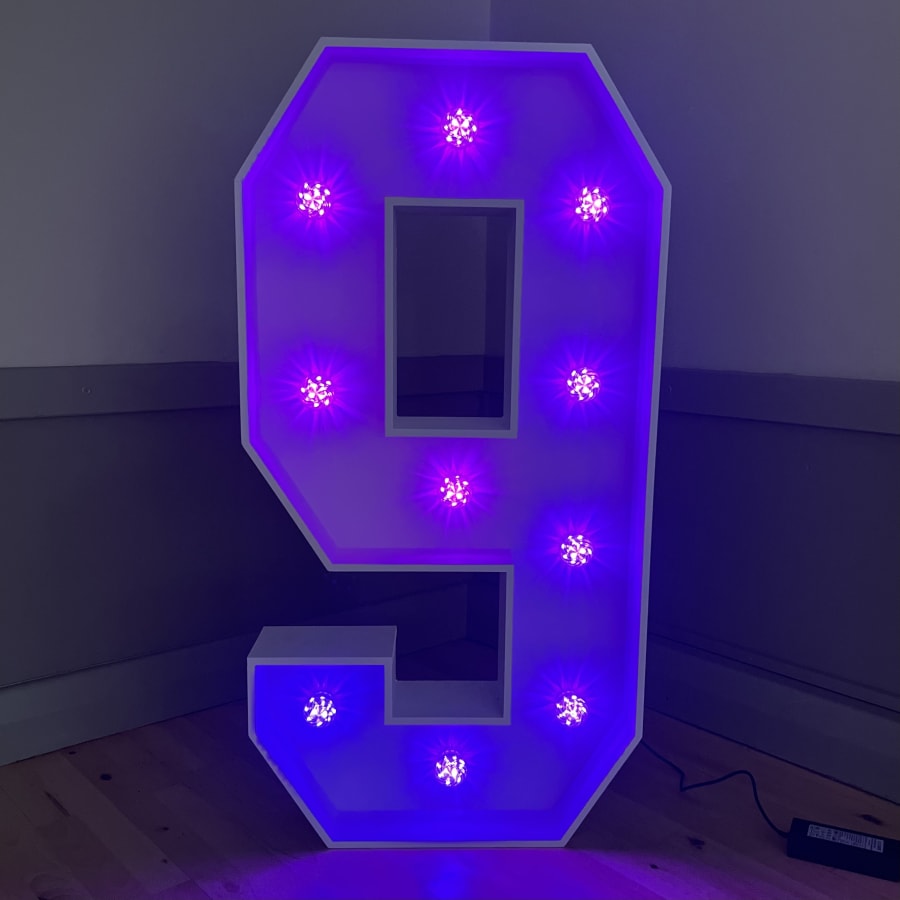 Our 4ft Light-Up LED Numbers can be set to a variety of stunning colours to match your theme. Whether you want a classic white glow, a vibrant multi-coloured display, or a specific colour like pink, blue, purple, yellow, orange, red or green, our LED Number 9 can bring your vision to life!