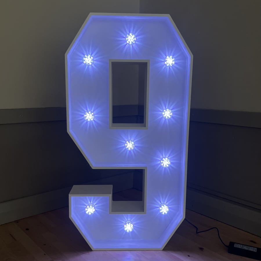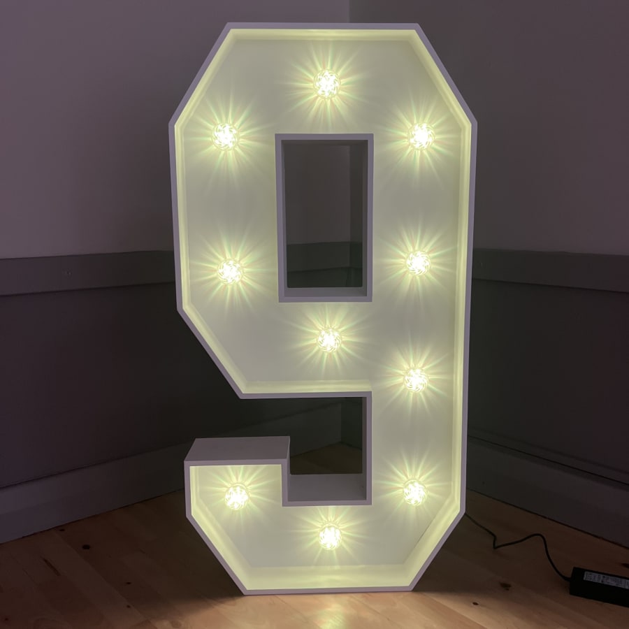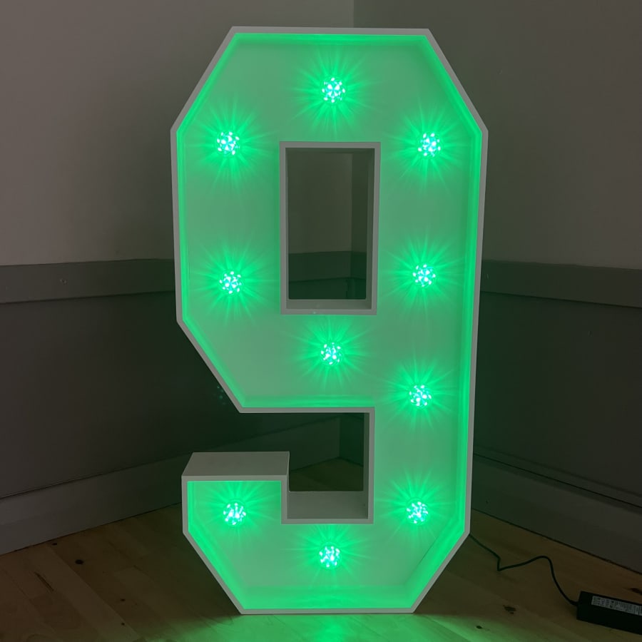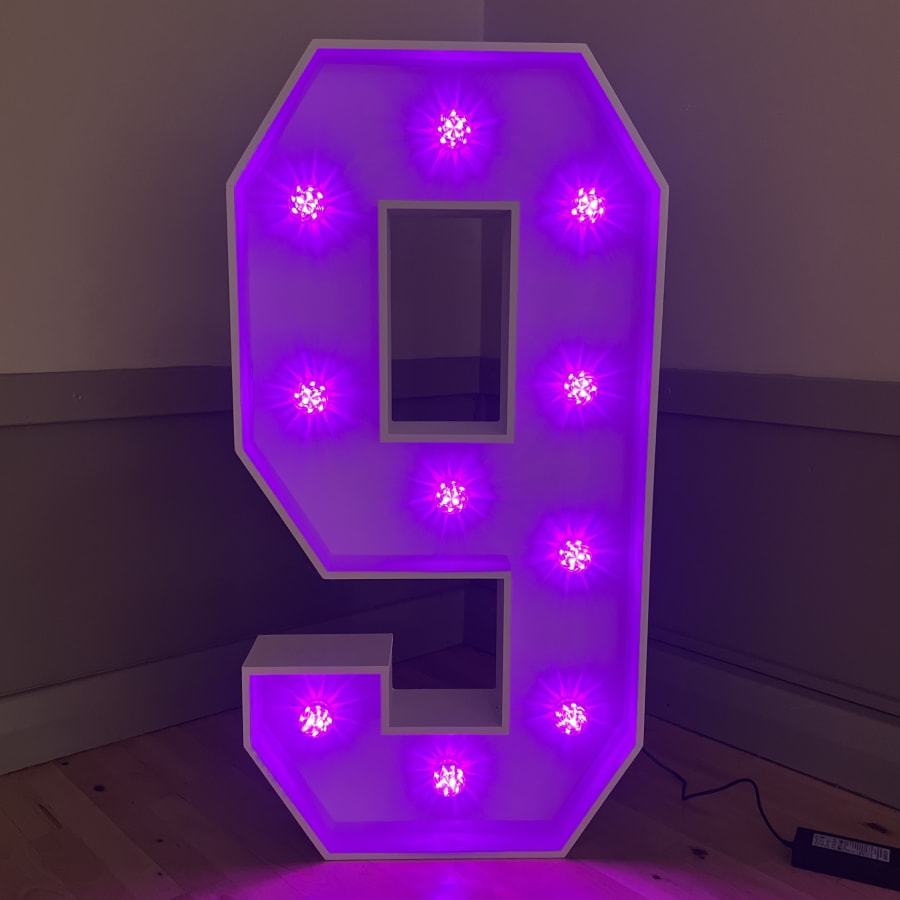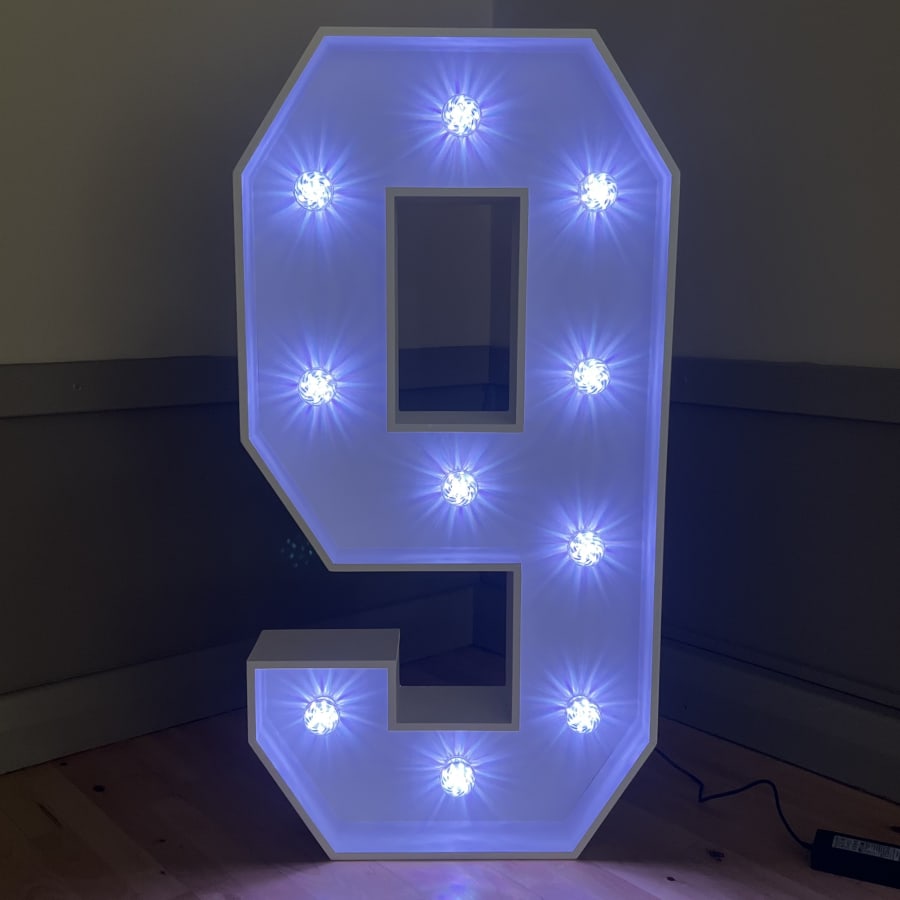 Our 4ft Light-Up LED Numbers can be set to a variety of stunning colours to match your theme. Whether you want a classic white glow, a vibrant multi-coloured display, or a specific colour like pink, blue, purple, yellow, orange, red or green, our LED Number 9 can bring your vision to life!