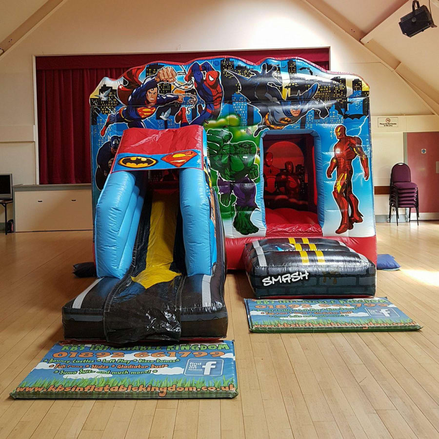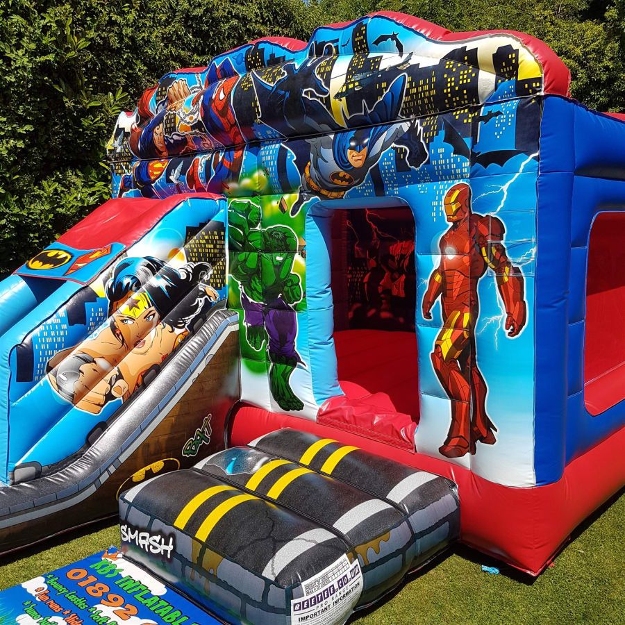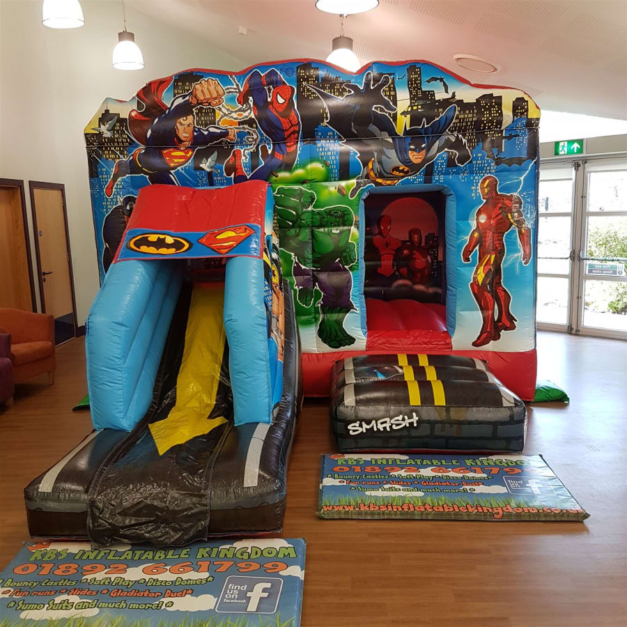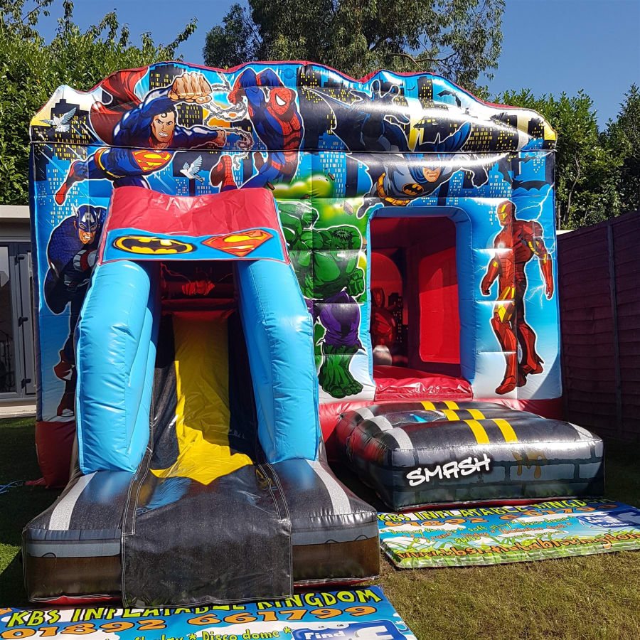Book the 13ft x 18ft Superhero Bounce and Slide now by clicking the Green "Book Online" Button at the top of this page, alternatively you can call our office on 01892 661799 and we will be more than happy to help you