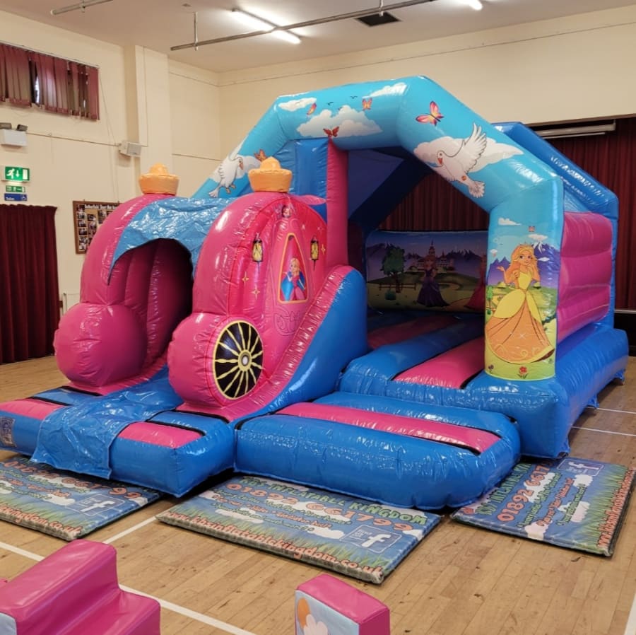 Includes: 13ft x 13ft Princess Bouncy Castle / Princess 17 Piece Soft Play Set / Princess Soft Play Rocker / Princess Soft Play Stacker / Princess Carriage Ball Pit + 2 Soft Play Horses