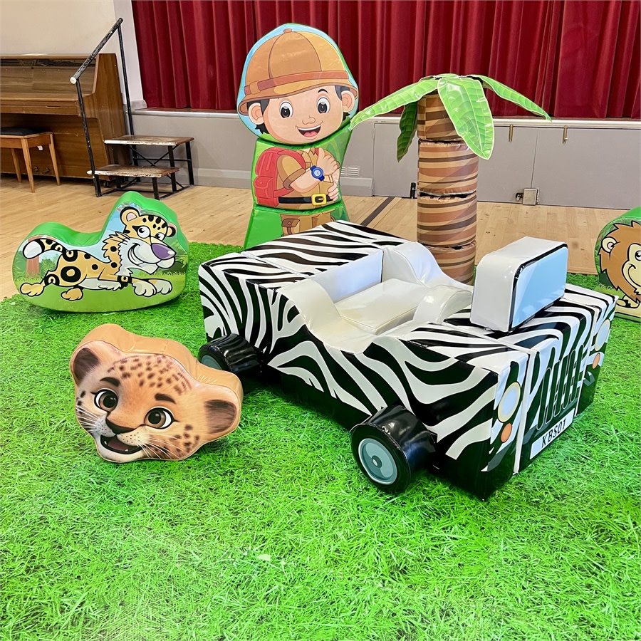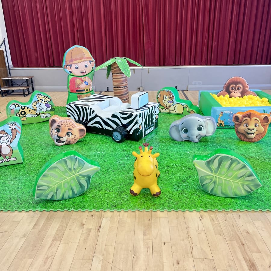 The Jungle Soft Play and Ball Pit package brings a Jungle themed play zone to your party. This set features soft play palm trees, grass effect matting, giraffe hoppers and a jungle ball pit to help spark the children's imagination.