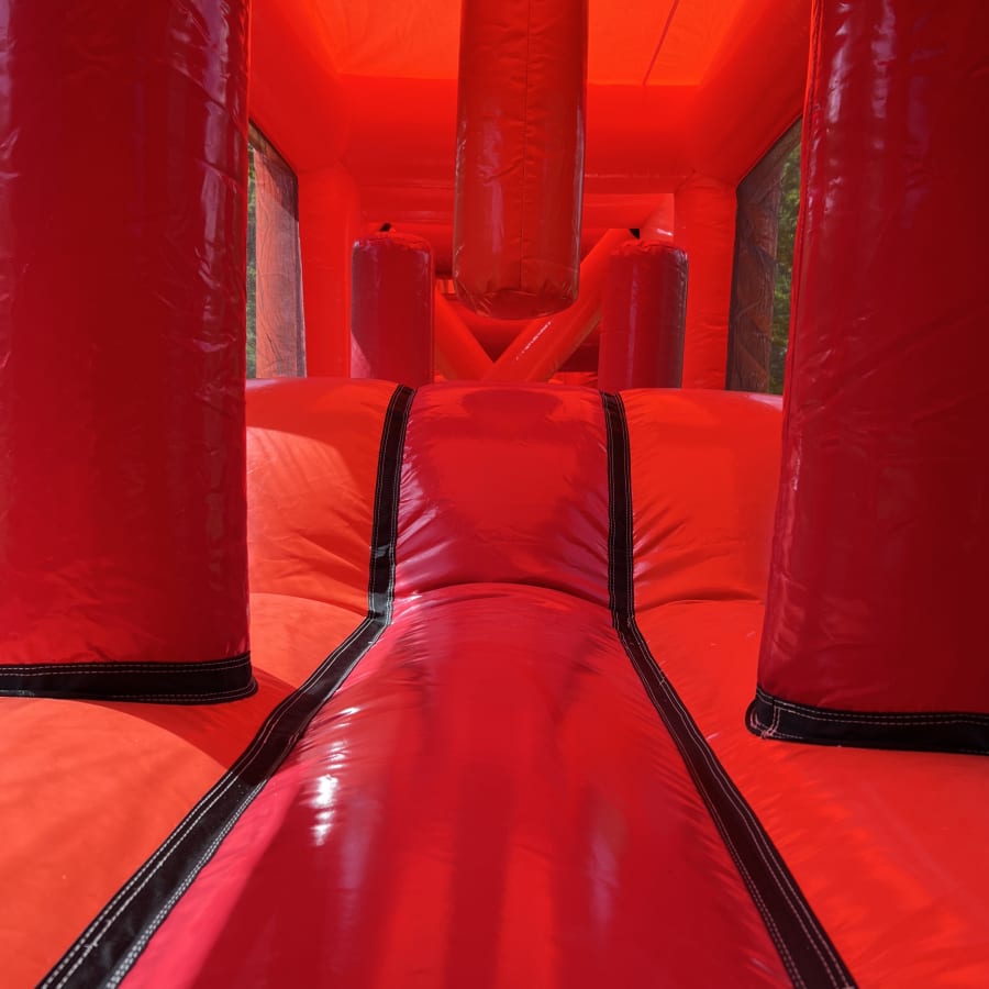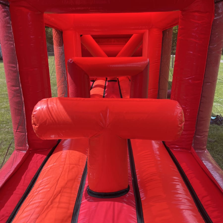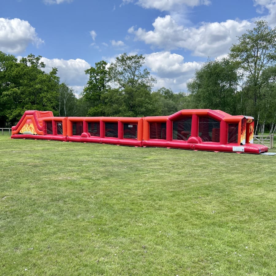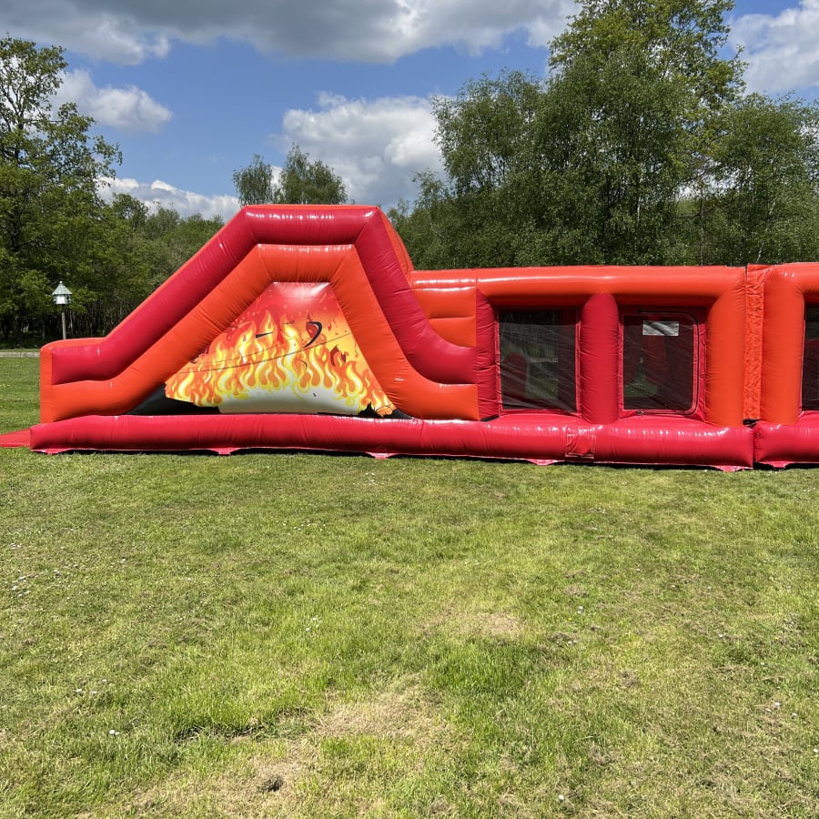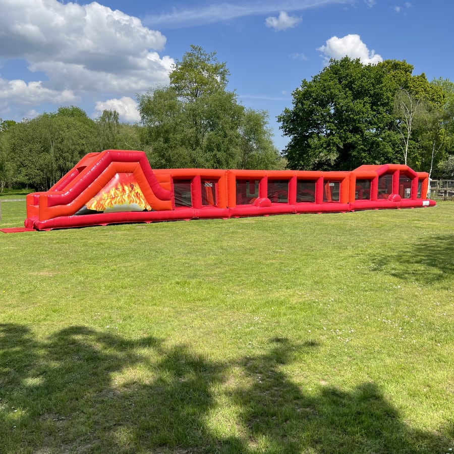 In a stunning red / orange and black design our 90ft long Burning Flames themed Assault Course is guaranteed to be a massive success at any School fete, Garden Party, Village Fun Day or Corporate Event
