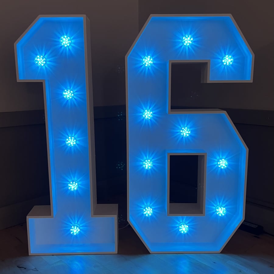 Our 4ft Light-Up LED Numbers can be set to a variety of stunning colours to match your theme. Whether you want a classic white glow, a vibrant multi-coloured display, or a specific colour like pink, blue, purple, yellow, orange, red or green, our LED Numbers 1 and 6 can bring your vision to life!