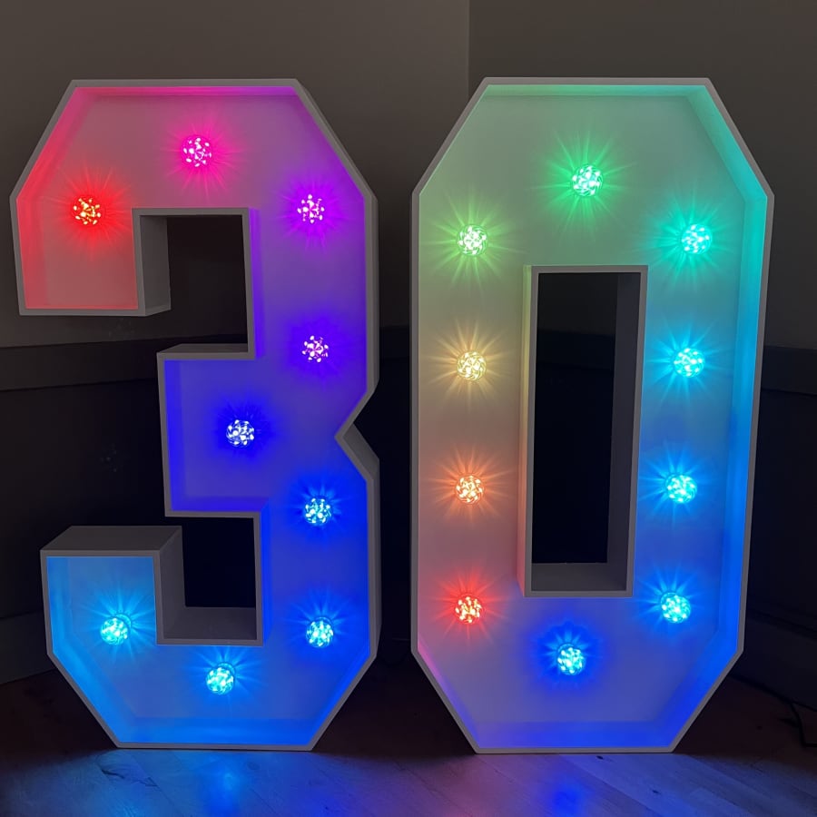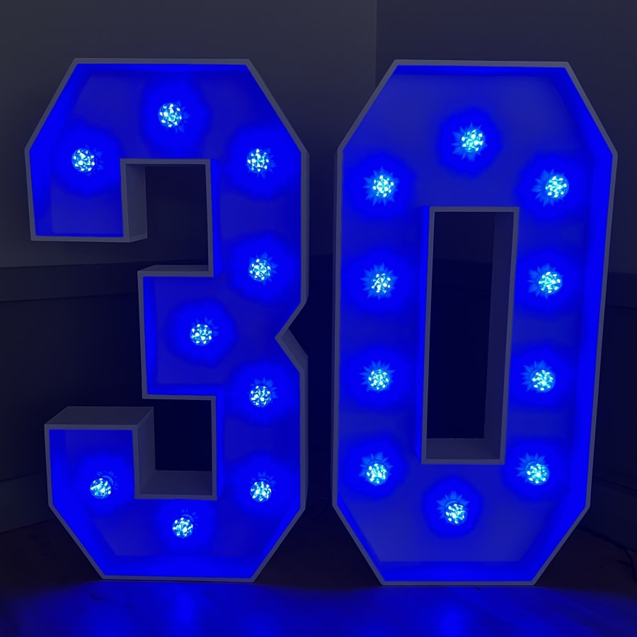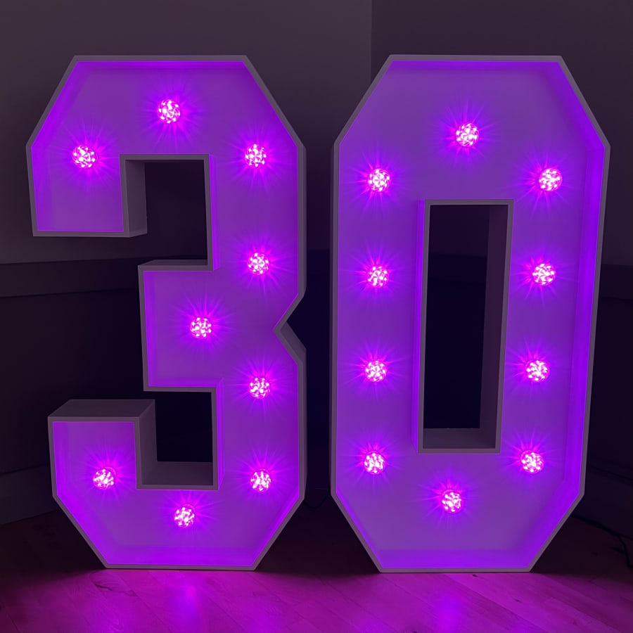 Our 4ft Light-Up LED Numbers can be set to a variety of stunning colours to match your theme. Whether you want a classic white glow, a vibrant multi-coloured display, or a specific colour like pink, blue, purple, yellow, orange, red or green, our LED Numbers 3 and 0 can bring your vision to life!