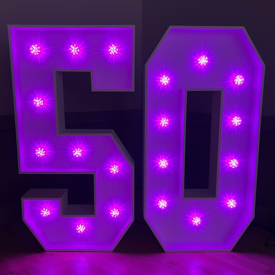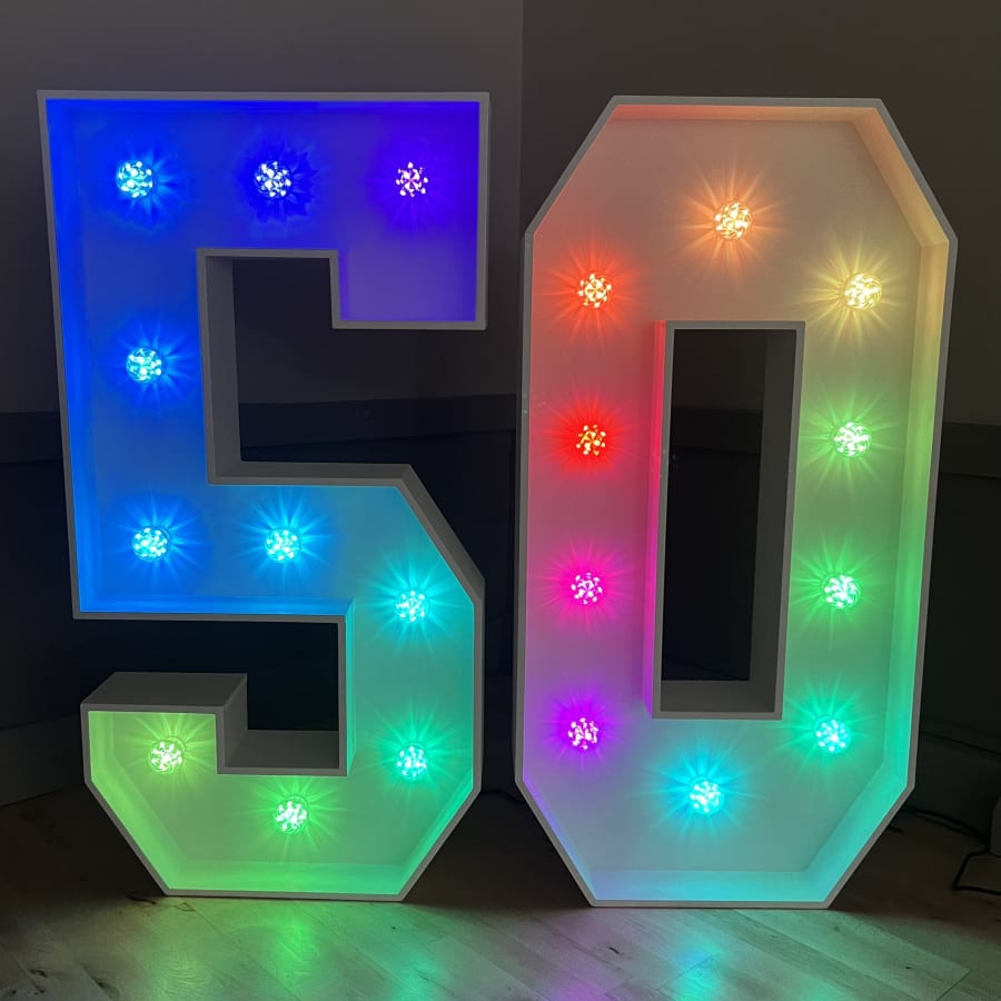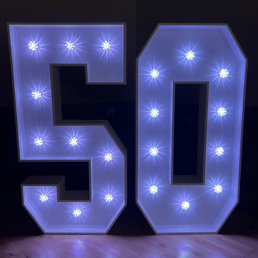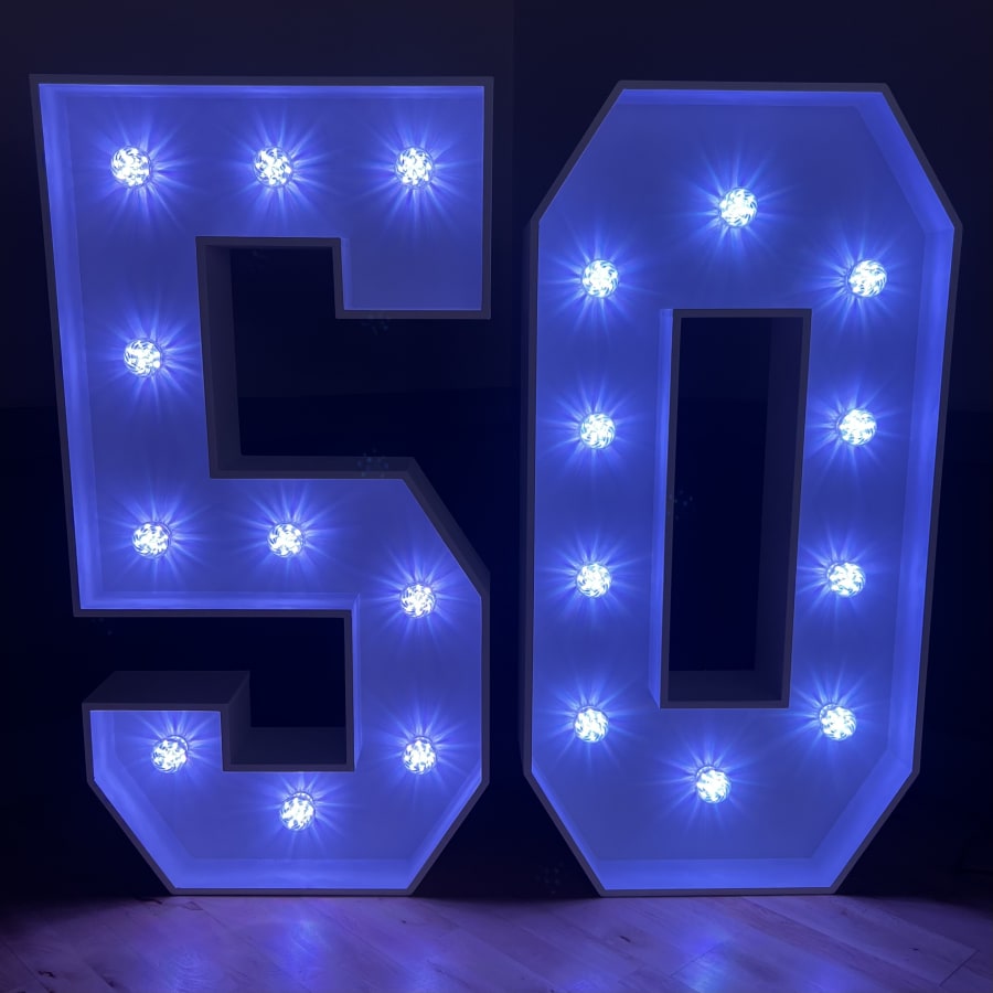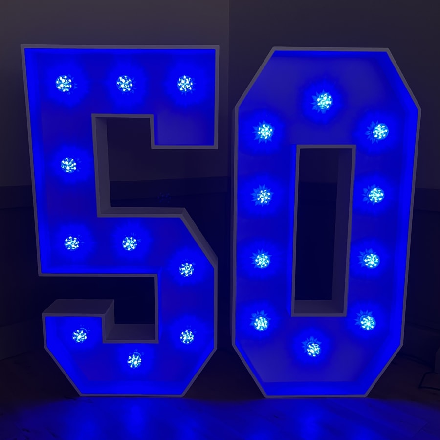 Our 4ft Light-Up LED Numbers can be set to a variety of stunning colours to match your theme. Whether you want a classic white glow, a vibrant multi-coloured display, or a specific colour like pink, blue, purple, yellow, orange, red or green, our LED Numbers 5 and 0 can bring your vision to life!