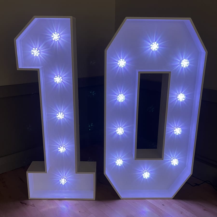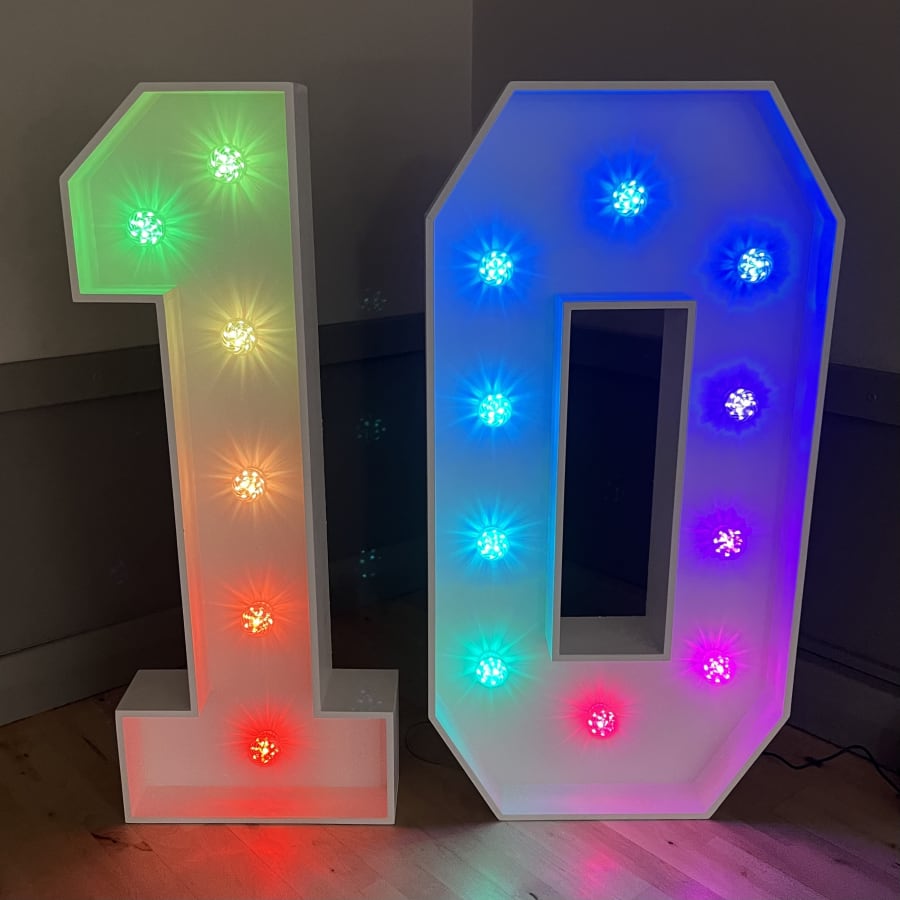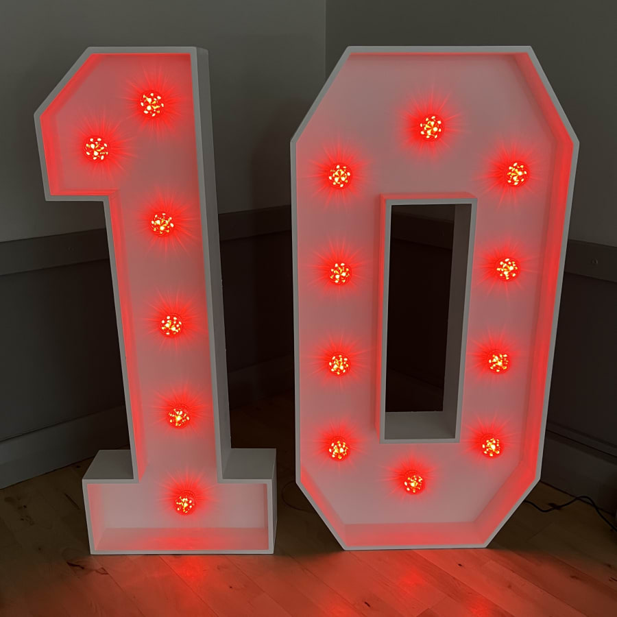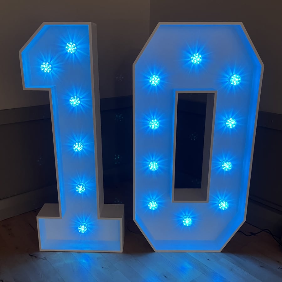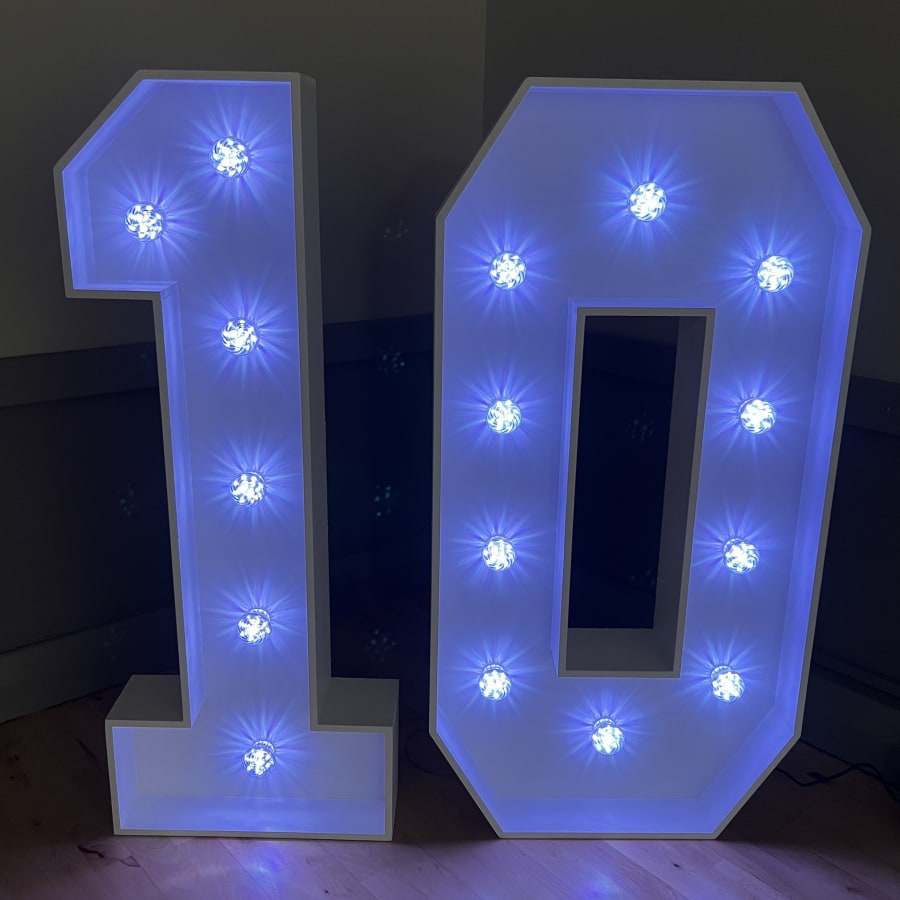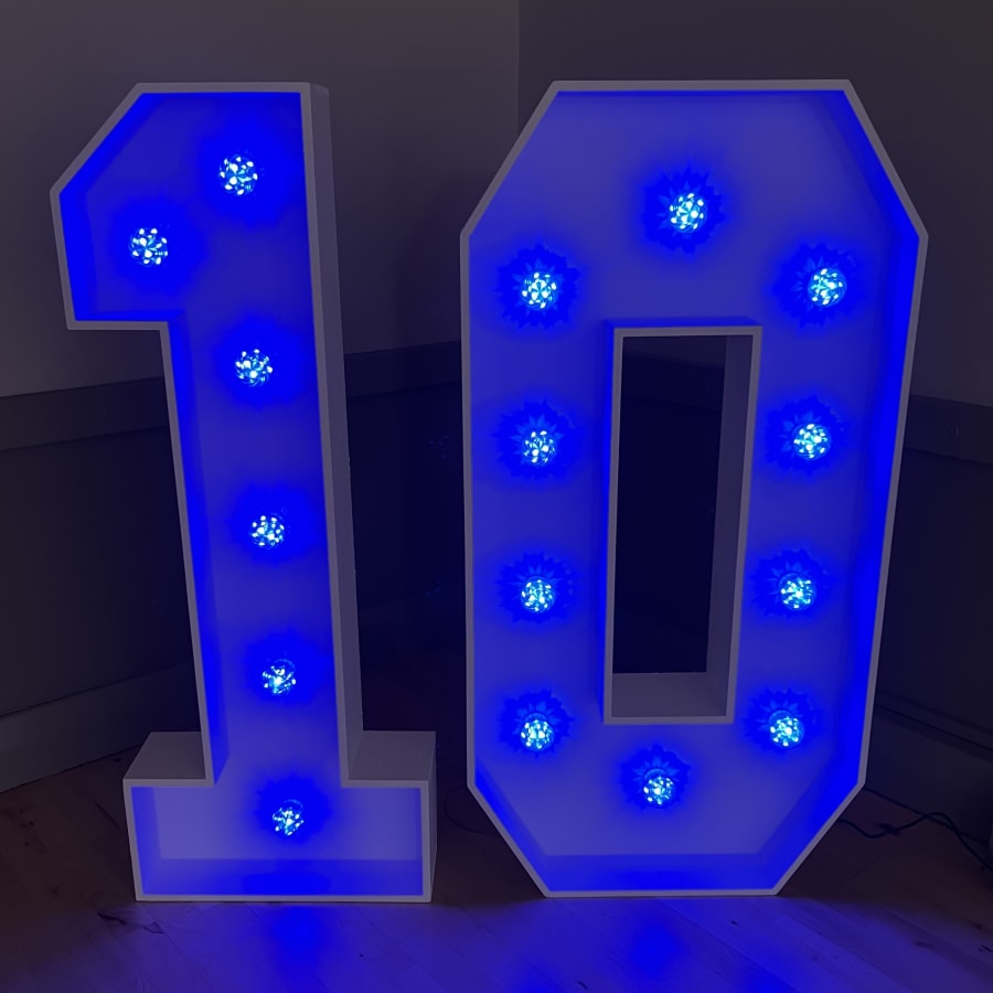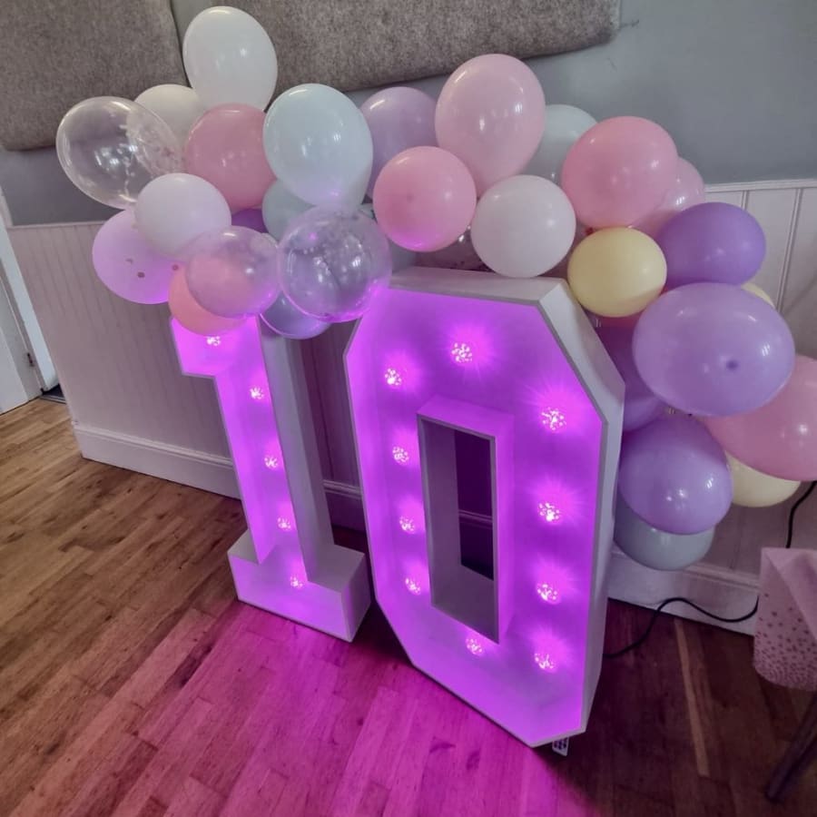 Our 4ft Light-Up LED Numbers can be set to a variety of stunning colours to match your theme. Whether you want a classic white glow, a vibrant multi-coloured display, or a specific colour like pink, blue, purple, yellow, orange, red or green, our LED Numbers 1 and 0 can bring your vision to life!