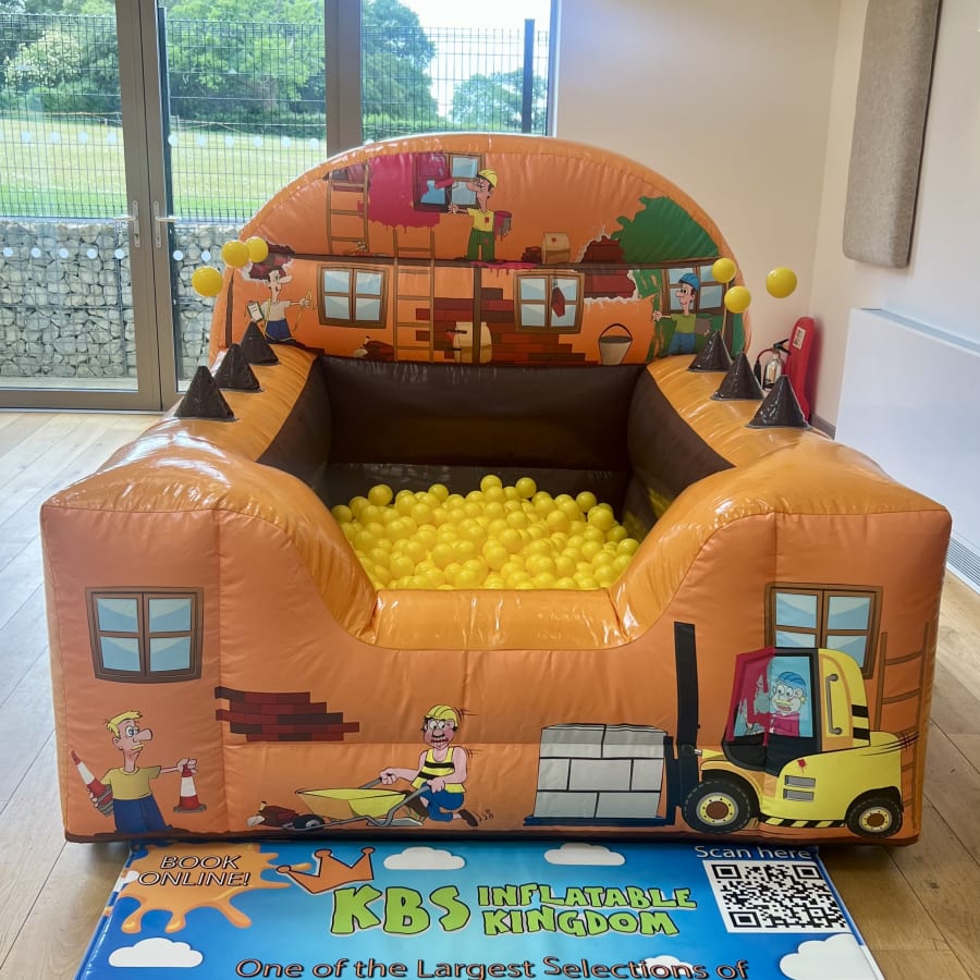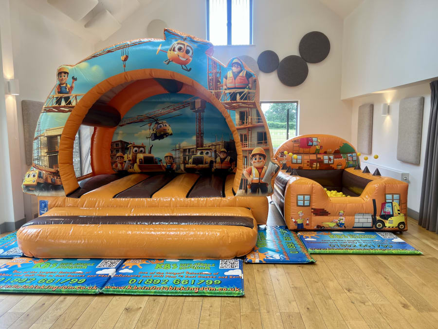 Book our Construction Bouncy Castle and Air Juggler Ball Pit now by clicking the Green "Book Online" Button at the top of this page, alternatively you can call our office on 01892 661799 and we will be more than happy to help you