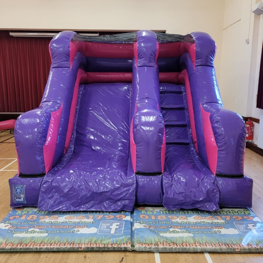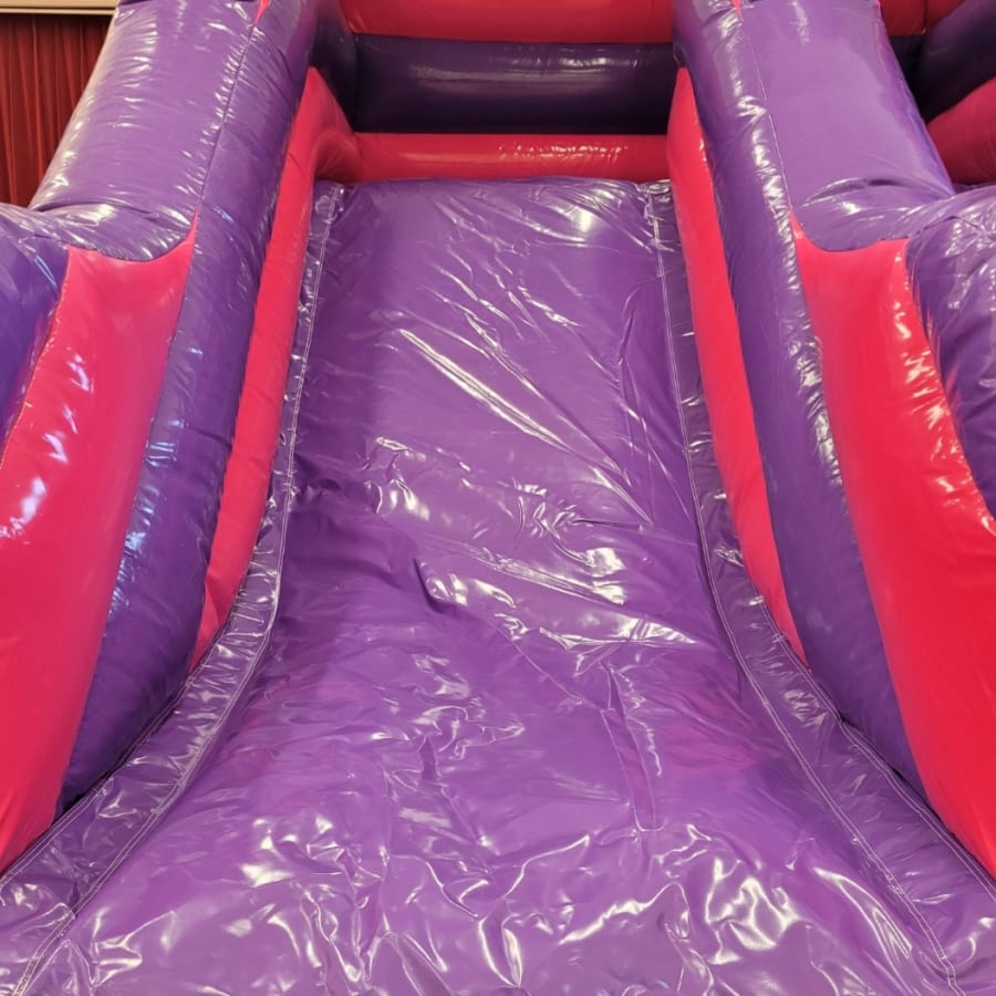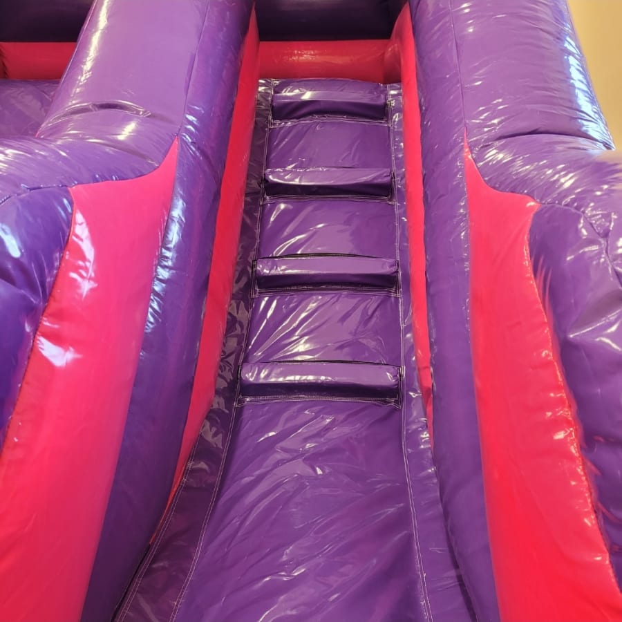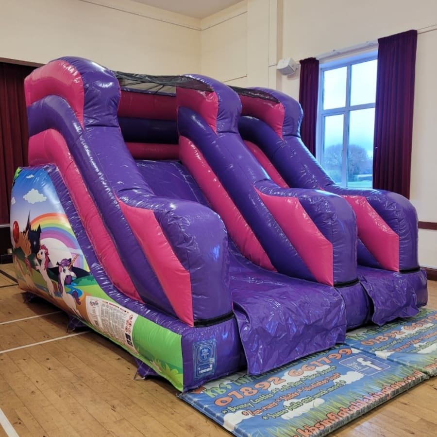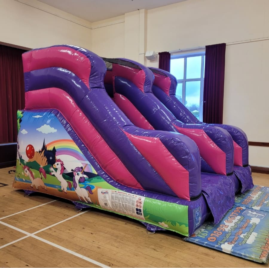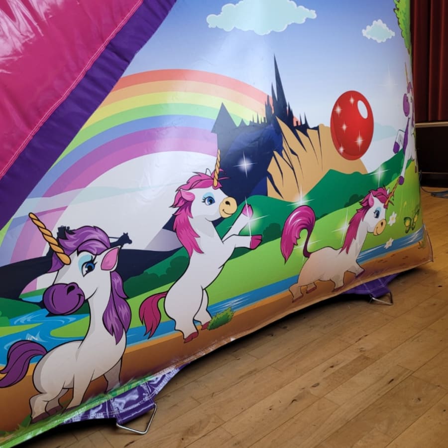 The Unicorn Bouncy Castle and Unicorn themed 5ft Platform Slide package combines two of our most popular products from our Unicorn Range . Both inflatables feature unicorns, butterflies and rainbows in a playful pink and purple colour scheme. Perfect for those looking for Unicorn themed party ideas and guaranteed to be the stand out attraction.
